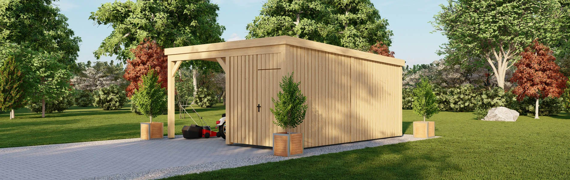 Der Carport Aralia kombiniert funktionales Design mit hochwertiger Verarbeitung und bietet eine ideale Lösung zum Schutz Ihres Fahrzeugs – ergänzt um praktischen Stauraum. Mit einer überdachter Fläche von knapp 29 m², aufgeteilt in einen offenen Carportbereich und einen Abstellraum, ermöglicht der Carport mehr als nur eine Unterstellmöglichkeit für Ihr Auto. Die Einfahrtsbreite beträgt 262 cm, was bedeuet, dass Sie bequem rangieren können. Das moderne Flachdach mit einer Neigung von 3° sorgt für eine zuverlässige Entwässerung. Für maximale Stabilität und Langlebigkeit wird hochwertiges Fichten-Leimholz der Festigkeitsklasse GL24 verwendet – robust, wetterbeständig und formstabil.. Im Lieferumfang enthalten sind der Rohbausatz, eine Holzaußentür, zwei Seitenwände, sämtliches Montagematerial sowie eine detaillierte Aufbauanleitung.