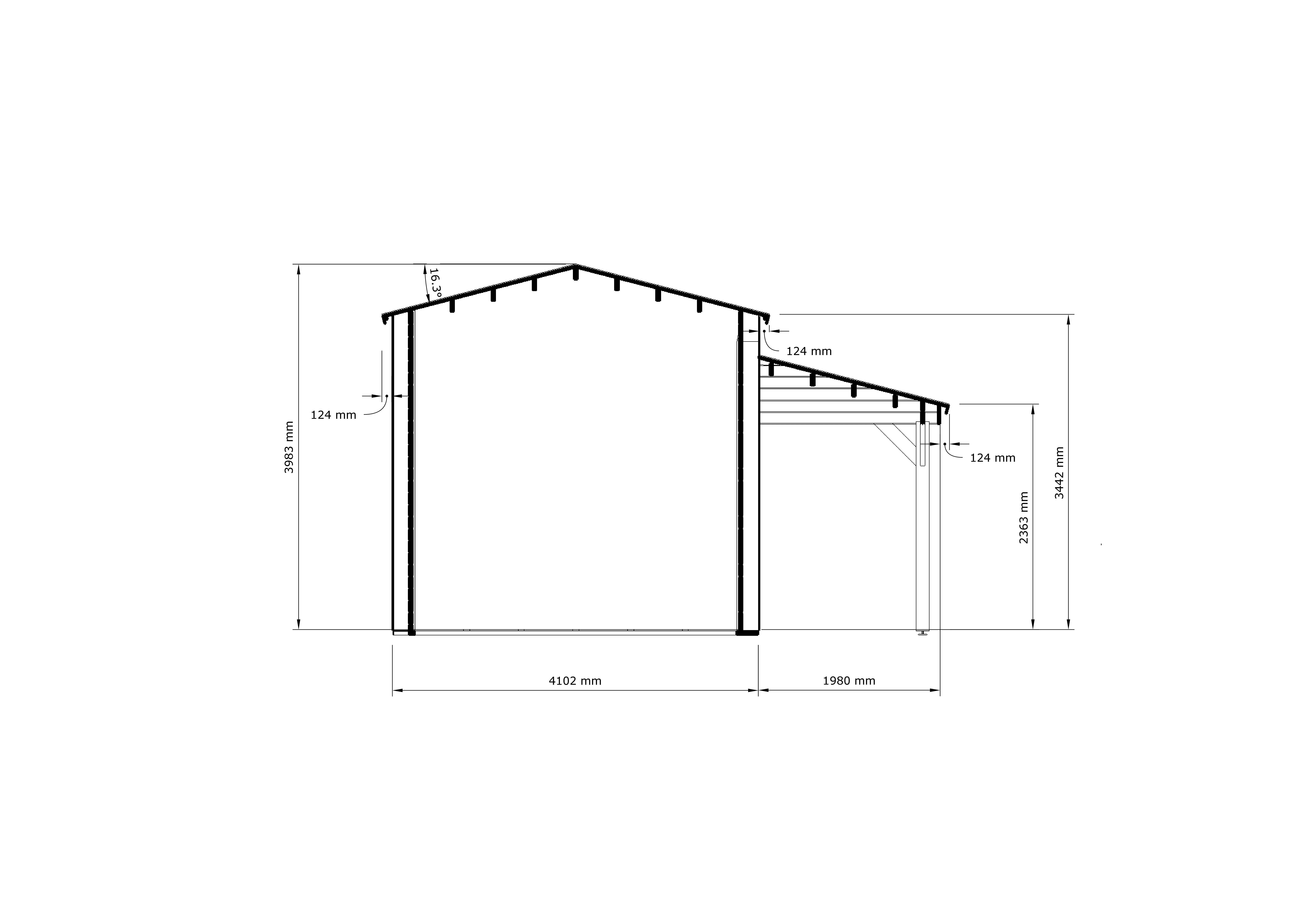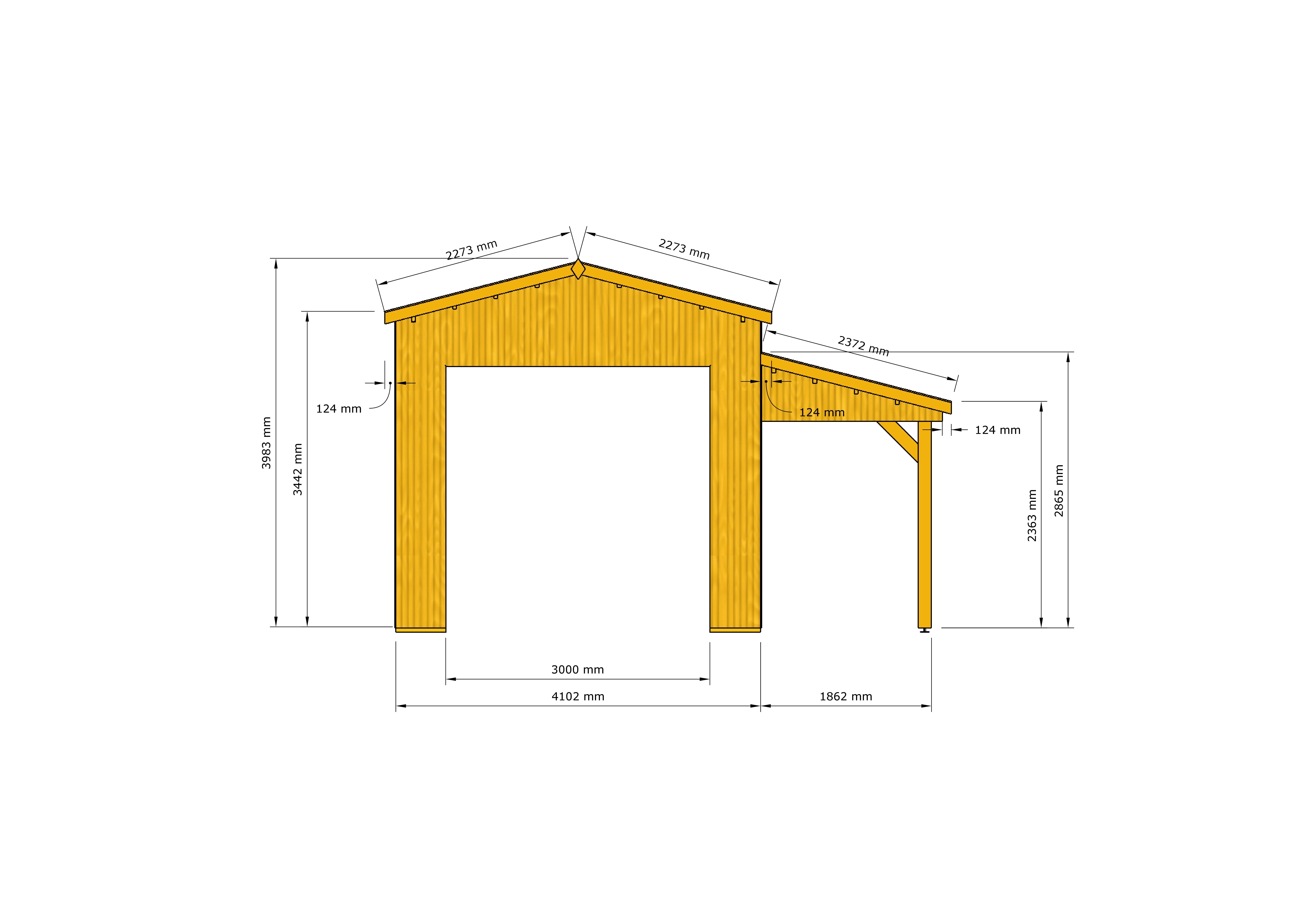 Das Vordach an der Seite der Garage bietet Schutz vor Witterungseinflüssen und kann perfekt genutzt werden, um Holz oder andere kleine Gegenstände zu lagern. Mit einer beeindruckenden Firsthöhe von 398 cm bietet die Betula Wohnmobilgarage ausreichend Platz für Ihr Fahrzeug und ermöglicht Ihnen gleichzeitig eine komfortable Nutzung des Vordachs.