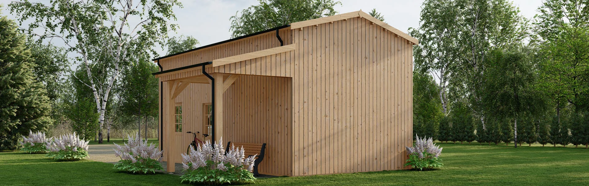 Wohnmobil garage Betula mit Holzverkleidung, 4×8 m, BF 40 m2 mit Vordach ohne Tor
