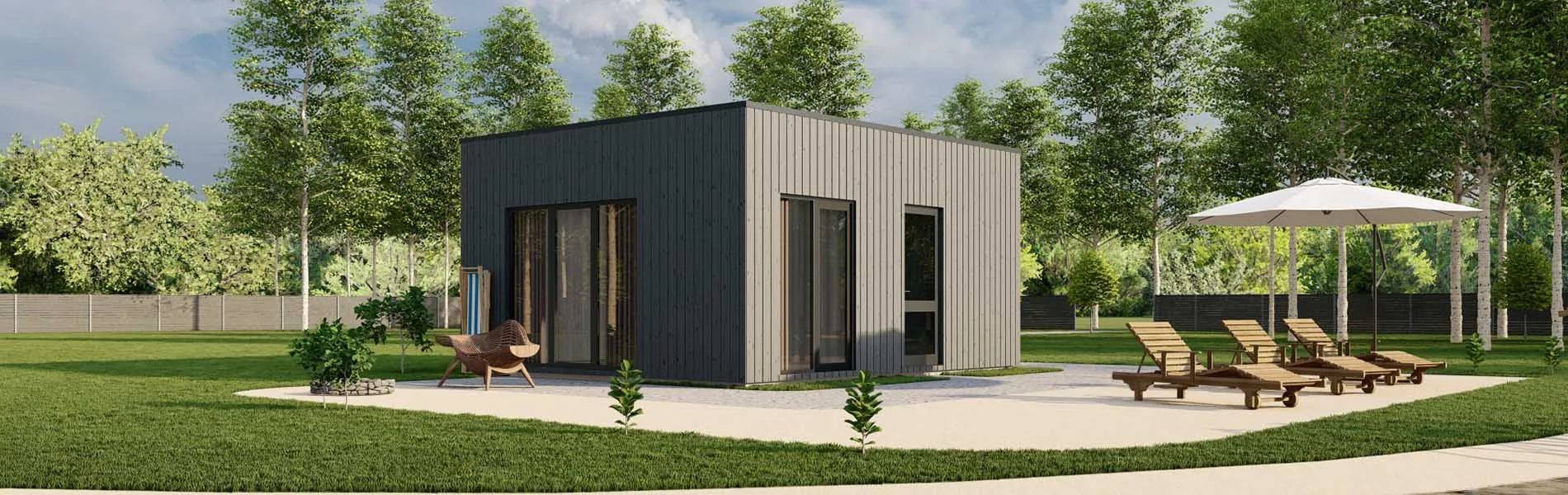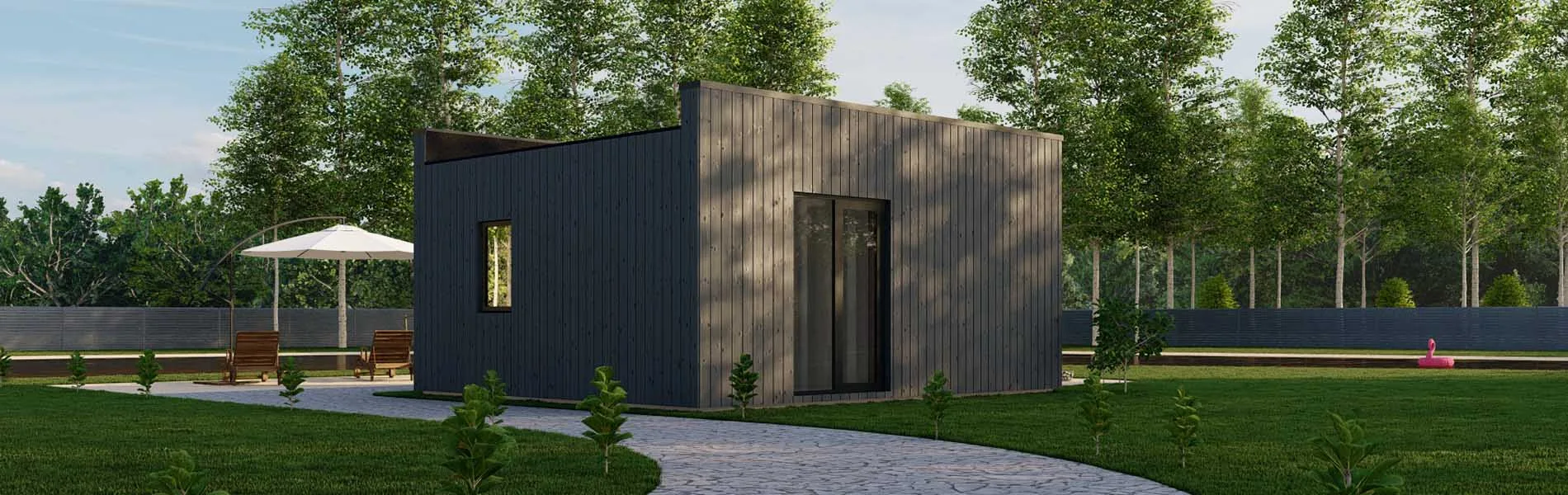 Das Flachdach verleiht dem Holzhaus Philadelphus eine moderne Ästhetik und schafft eine harmonische Verbindung zwischen Funktionalität und Design. Mit einer kompakten Größe von 6×5 Metern bietet dieses Haus dennoch ausreichend Platz für einen komfortablen Aufenthalt.