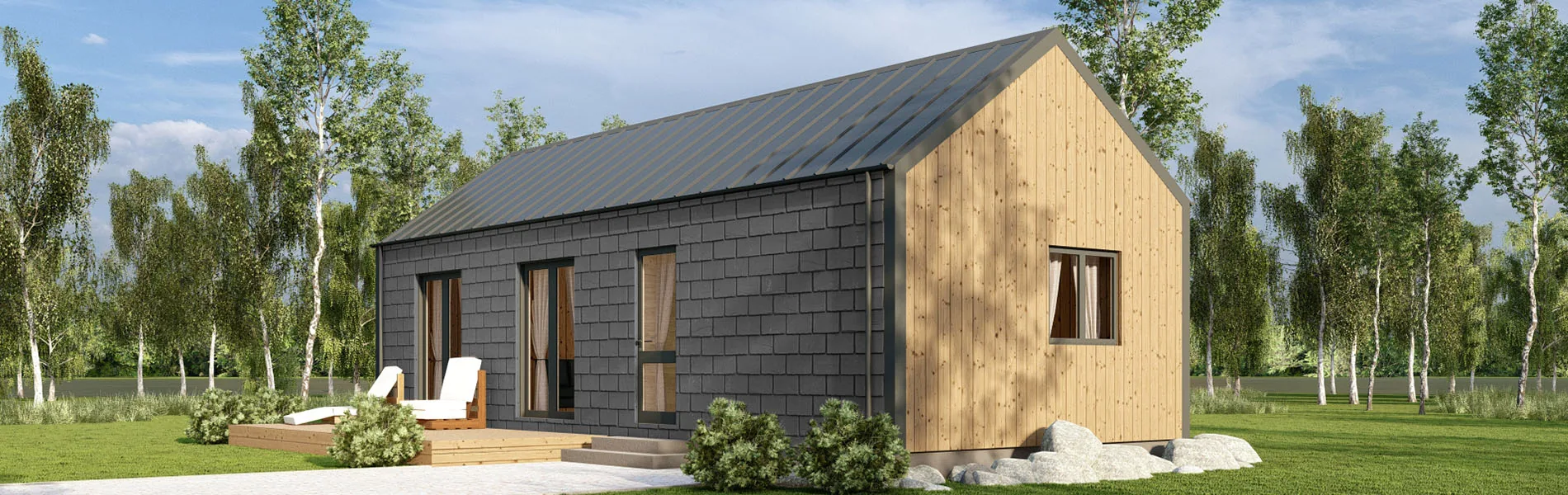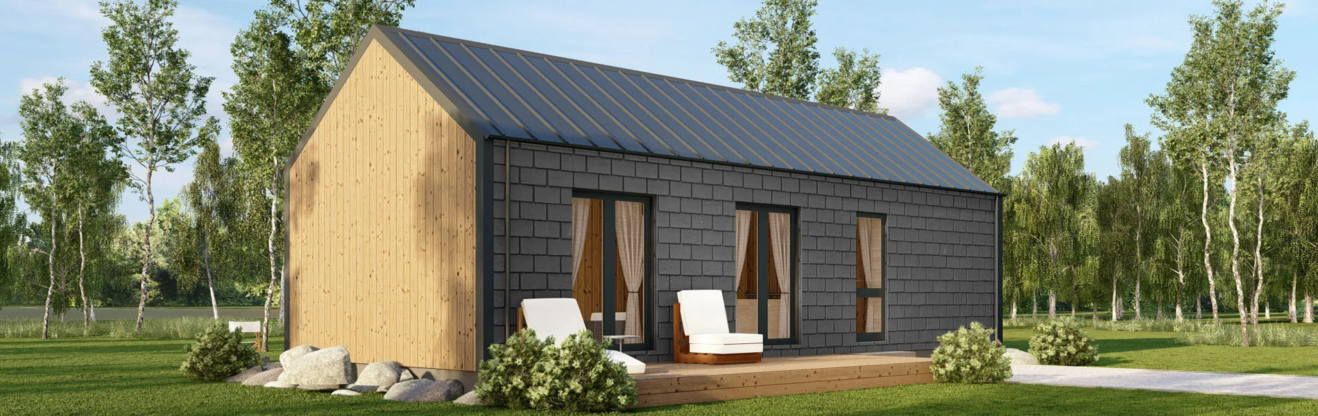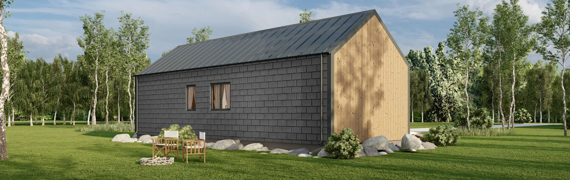 Die Kombination aus edlen Naturschieferplatten auf den langen Seiten und senkrechter Holzverschalung auf den kurzen Seiten verleiht dem Holzhaus Bergamia einen unvergleichlichen Charme und macht es zu einem wahren Blickfang. Diese einzigartige äußere Gestaltung ist nicht nur ästhetisch ansprechend, sondern auch ein Symbol für Qualität und Stil.
